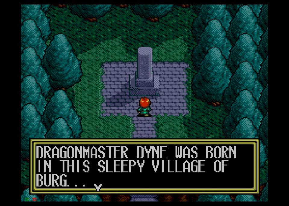 The game begins in the small mountain town of Burg, where young Alex Noa frequently visits the monument to the fallen hero Dragonmaster Dyne. At the behest of Ramus, eager son of the town mayor, they embark on their first real adventure with their friends, Nall